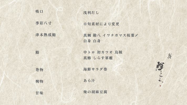 (例:銀座の懐石、神楽坂の鮨、新宿の肉割烹 など)