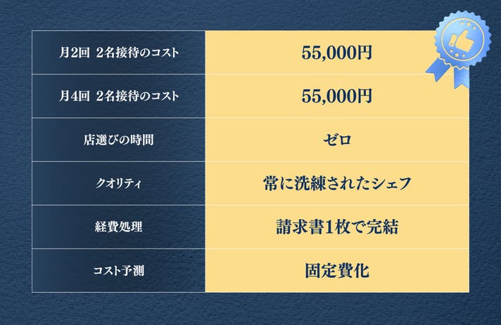 2名枠で週1回の接待をフルに行っても、余裕を持ってご利用いただける設計です。