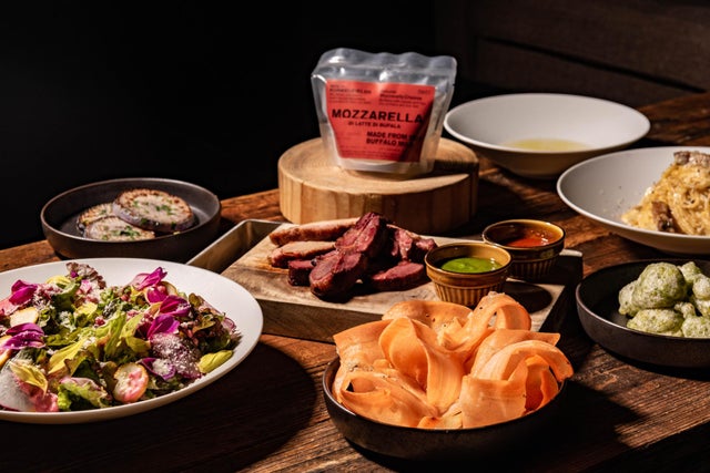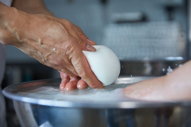 本場イタリアで研鑽を積んだチーズ職人、竹島英俊さんが、たっぷり愛情をかけ育てた水牛のミルクを朝3時に絞り、発酵させ熱湯で練りこみ、手でちぎり成形。午前9時には全国のレストランに発送される。1日15kgしか製造できない究極のモッツァレラは、まさに”いのちのめぐみ”。