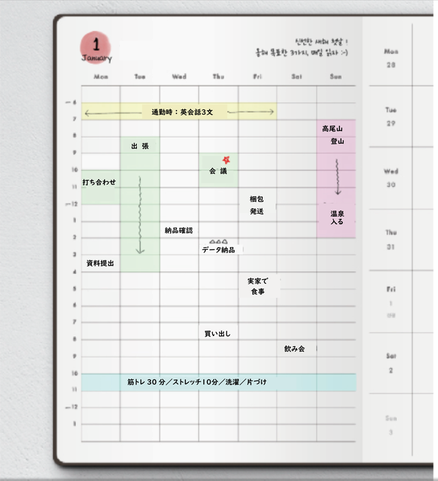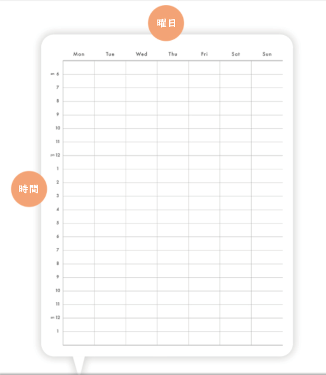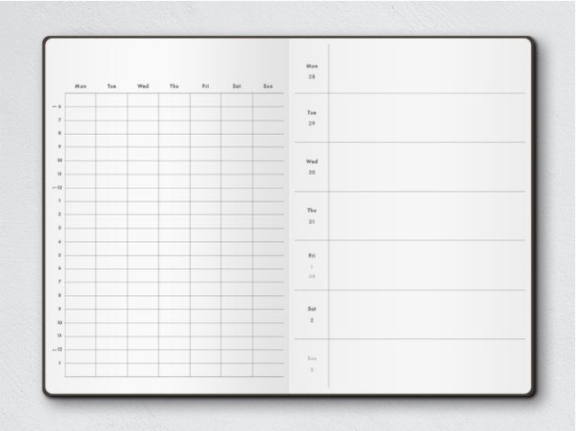 追加の説明が必要な場合は、右側の曜日別のページに詳細を記録することができるように、大きくスペースを取ってあります。