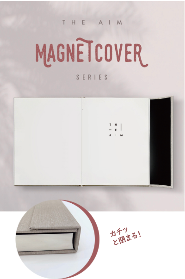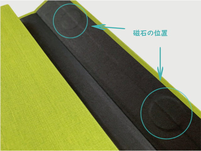 丸い磁石2つがカバーと裏打ち紙の間に入って固定されており、手帳を包み込んでくれます。