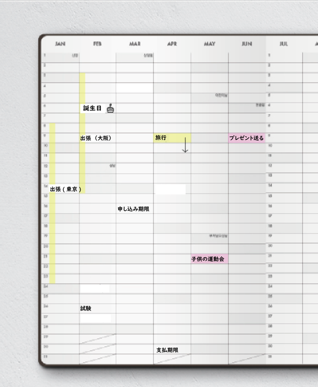 プロジェクトの開始と終了、学期や休みの期間、旅行の予定を記入しておけば、1年の計画を視覚的に一度で確認することができます。