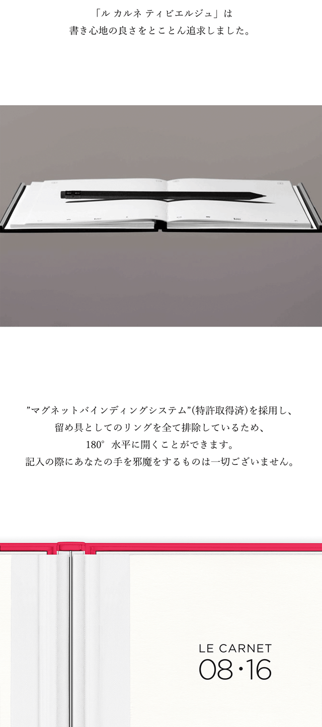 - 留め具としてのリングをすべて排除しているので180°開閉。記入の際に邪魔するものは一切なし