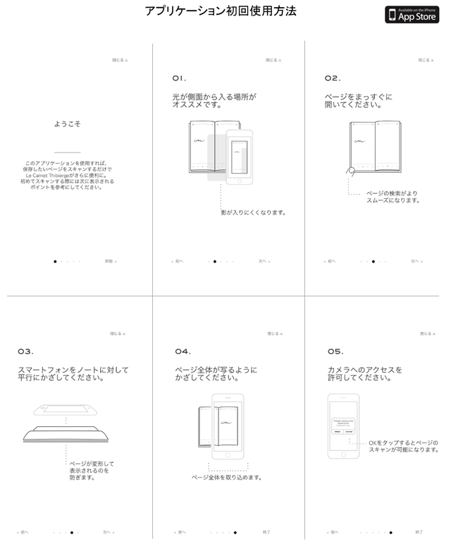 A:App Storeにて「Thibierge」または「le carnet」と検索いただくとアプリが表示されますのでダウンロードしてください。アプリケーション初回使用方法は以下にまとめますのでご確認ください。