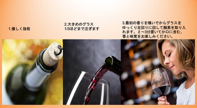 ワインによって美味しい飲み方が多少異なります。こちらは今回掲載する3種のワインの美味しい飲み方です。全てのワインに該当するものではありませんので、ご了承ください。