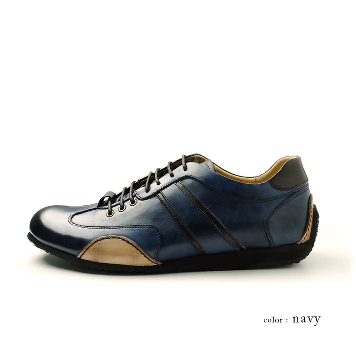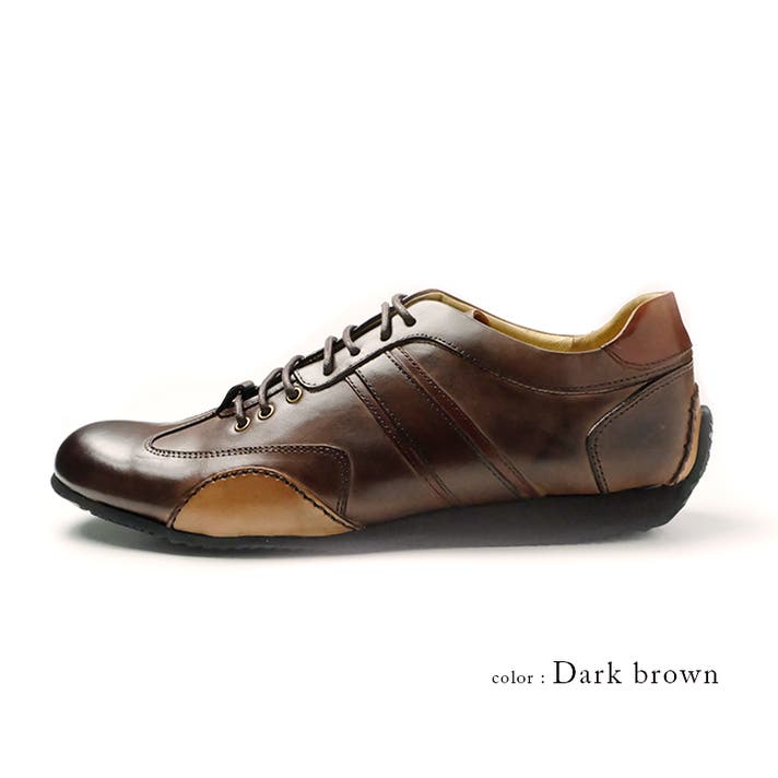 アッパーは本革の風合いを生かした加工を施し、2色の革を重ね合わせたサイドラインがアクセントに。