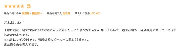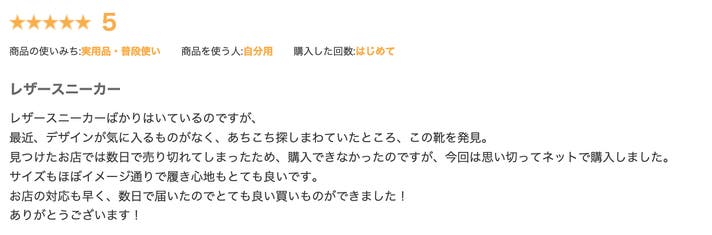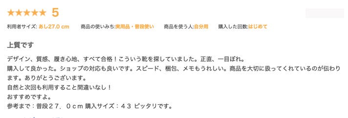 『デザイン、質感、履き心地、すべて合格!こういう靴を探していました。正直、一目ぼれ。購入して良かった。ショップの対応も良いです。スピード、梱包、メモもうれしい。商品を大切に扱ってくれているのが伝わります。ありがとうございます。