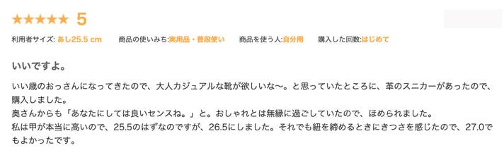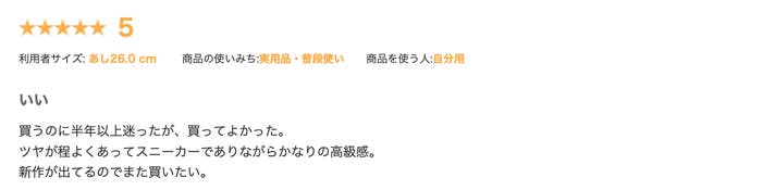 『買うのに半年以上迷ったが、買ってよかった。ツヤが程よくあってスニーカーでありながらかなりの高級感。新作が出てるのでまた買いたい。』