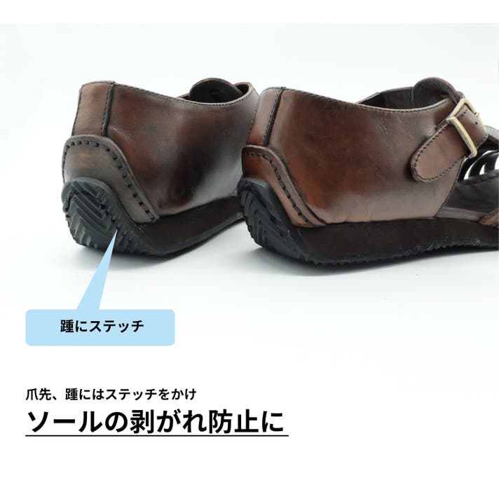 また、ソールの爪先と踵部分はステッチをかけ、剥がれ防止に。強度もアップ。