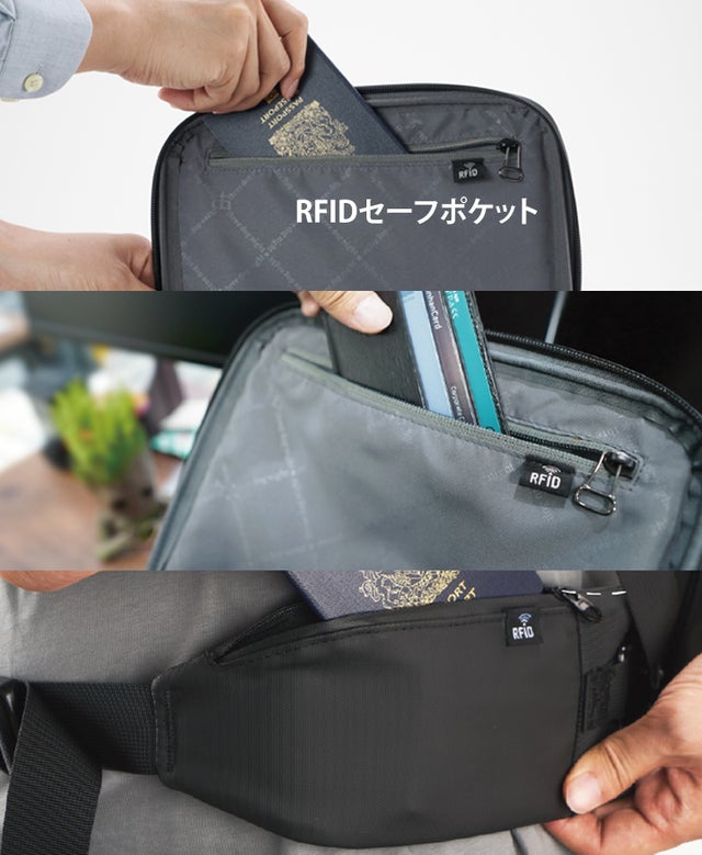 ウエスト部分のサポートベルトにもRFIDポケット完備、パスポートなどを収納しておくことができます。