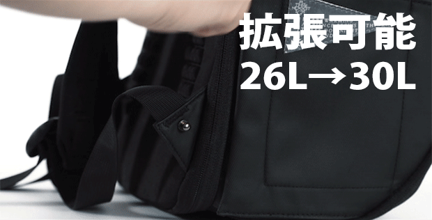 本体はジッパーを開けることで容量を26Lから30Lまで拡張することができます。
