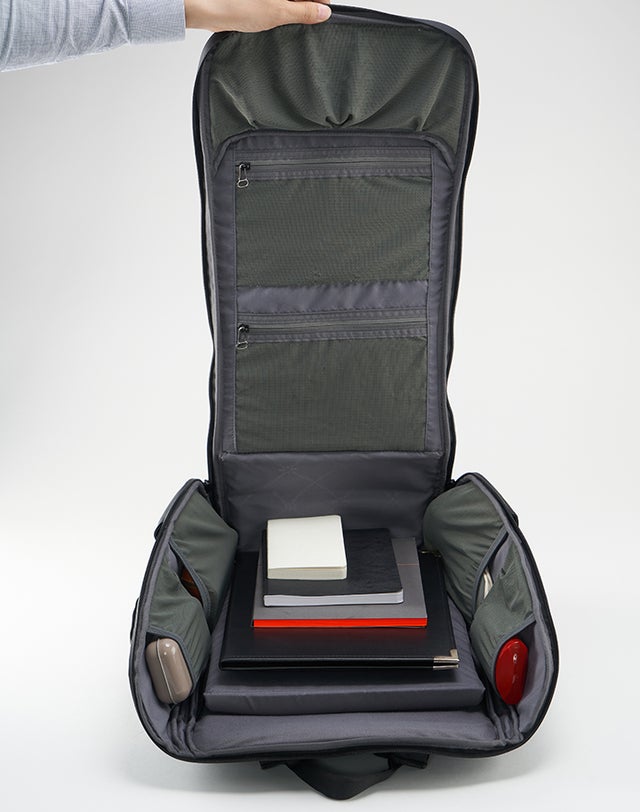 荷物があまり入っていないように感じられながらも、実は多くの荷物を収納できる・・・それこそ求めるバックパックの姿です。究極的に言えばそれが完璧なバックパックに必要なものではないでしょうか。弊社が目指したのはスマートな整理システム備えたバックパックです。
