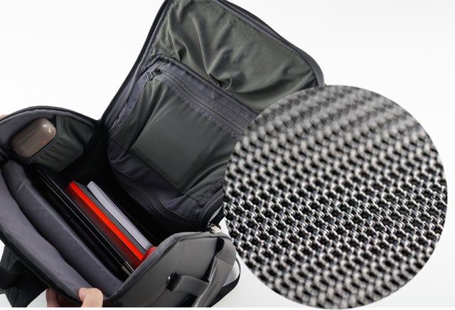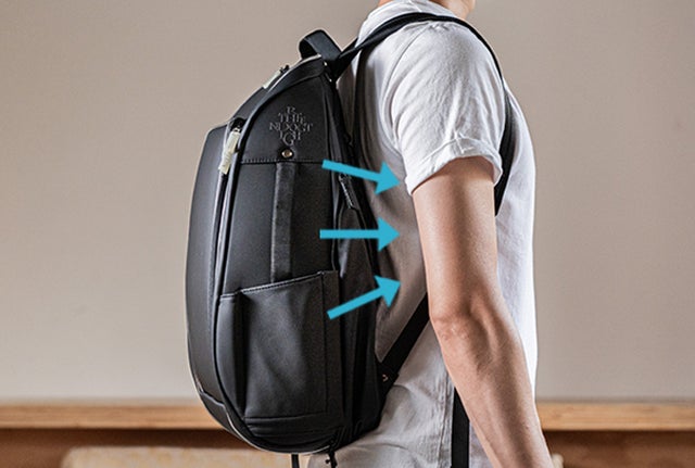 一般的なバックパックは荷物の重心は下方に集中し、肩に多く負担がかかります。TDNビジネスバックパックの場合はバッグ本体を背中に密着させて重みを分散、肩だけに負担が行かないように重みを分散してくれます。