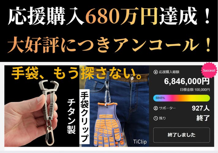 「Makuake(マクアケ)」は、実行者の想いを応援購入によって実現するアタラシイものやサービスのプラットフォームです。このページは、 プロダクトカテゴリの 「【アンコール】手袋をなくす問題を解決!片手でサッと挟める軽量チタン製手袋クリップ」プロジェクト詳細ページです。