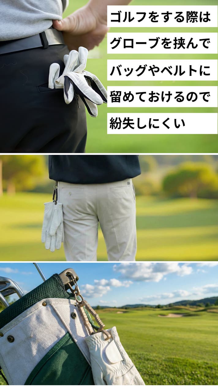 カラビナ付きなので、ゴルフバッグやベルトなどにも簡単に装着でき、プレー中に外したグローブもなくさずスマートに携帯できます。