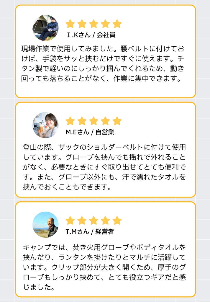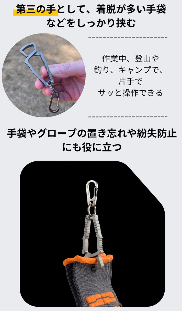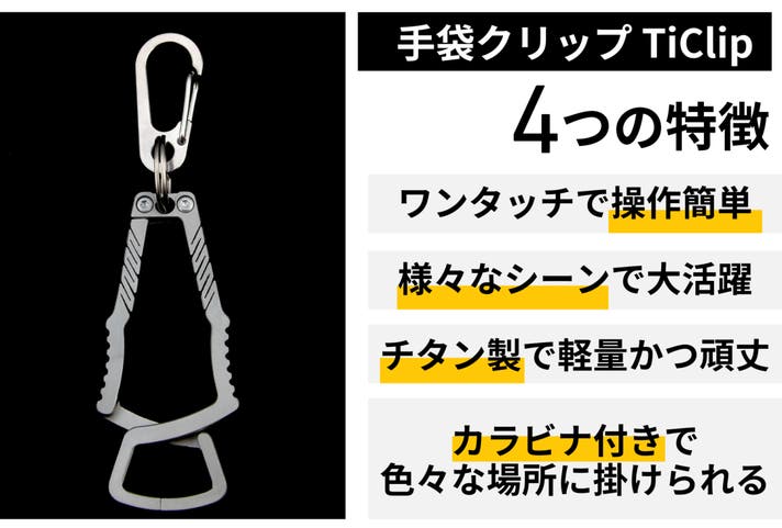 TiClipは、軍手・作業用手袋・サイクリンググローブはもちろん、スノーボードなどのウィンターグローブにも対応し、アウトドアや登山、釣りでは帽子やタオルの固定にも使えるため、幅広いシーンで活躍します。