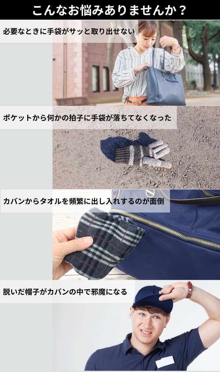 また、ベルト以外も、かばんの持ち手などにつけて、外した手袋や帽子をサッと挟んでおけば、移動中も両手が空いて快適です。