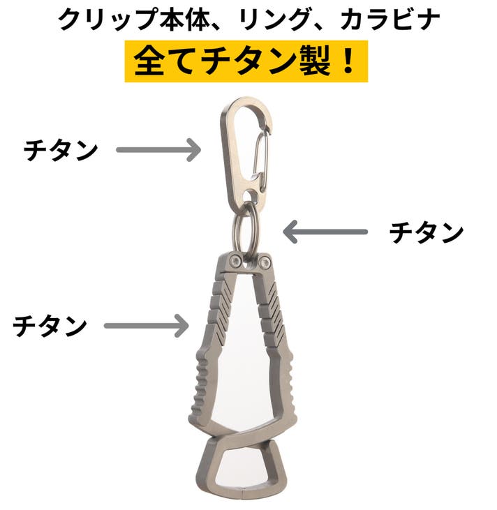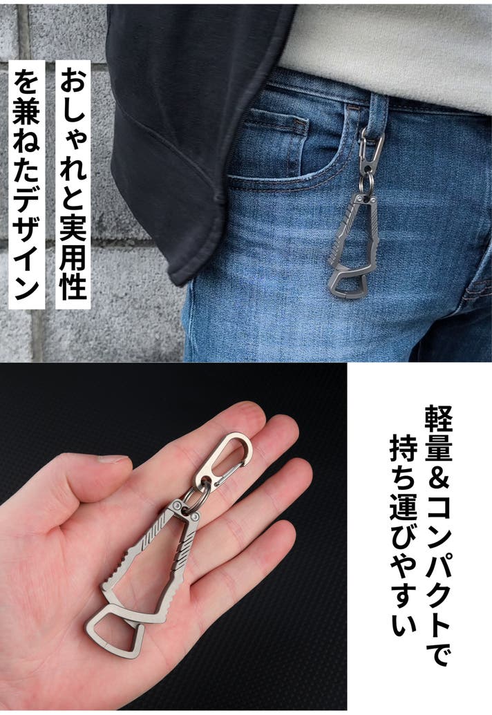 チタン製カラビナ付きで、バッグやベルトループなど、好きな場所に取り付けできます。