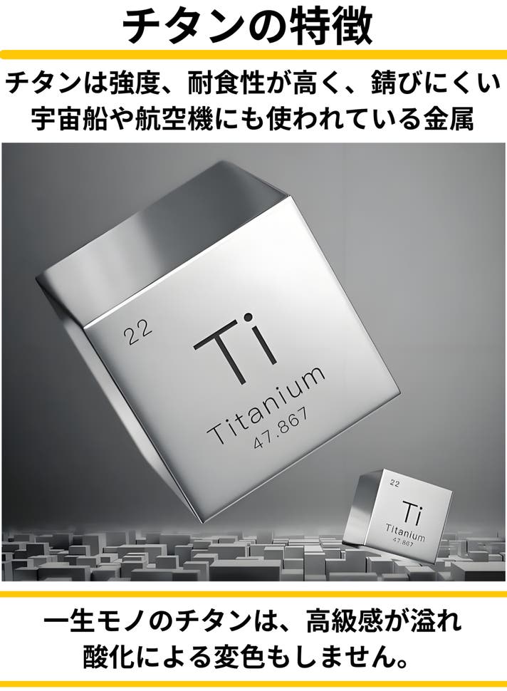 さらに!チタンの質量は鋼鉄の約55%と非常に軽いのも特徴です。