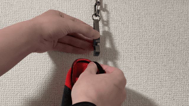 挟みたい手袋(またはタオル)をクリップで固定し、カラビナでベルトループやバッグに掛けるだけです。