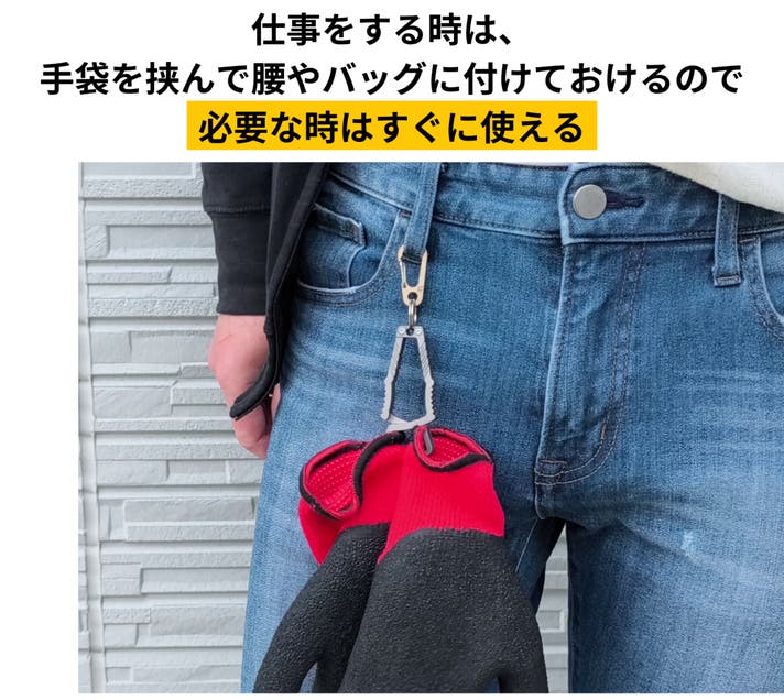 A : 手袋を挟んでバッグやベルト、リュックのショルダーハーネスなどに取り付け、手袋の“定位置”を作るためのクリップです。外した瞬間にサッと挟めるので、「手袋がない!」と探す時間を減らし、移動中も両手を空けやすくなります。