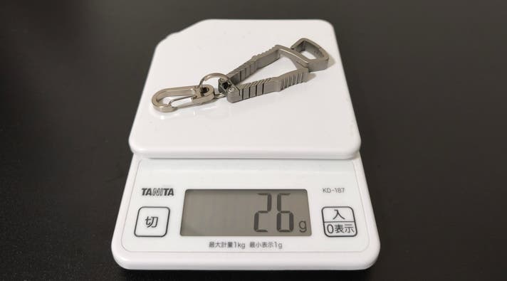 A : TiClipは約26gで、ベルトに付けても重さが気になりにくく、ポケットやバッグに入れても負担になりにくい設計です。