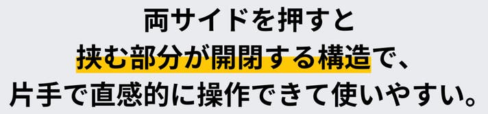 Z字型の開口デザインにより挟むものとの接触面積が増え、揺れや激しい動きの中でも落ちにくくなっています。
