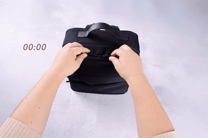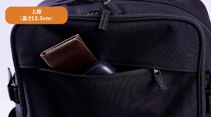 「リュックは取り出しにくい」という常識を、独自の上下二段構造が覆します。 移動中の限られた時間、リュックをわざわざ地面に下ろしたり、メインファスナーを全開にする必要はありません。