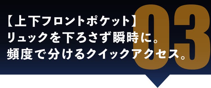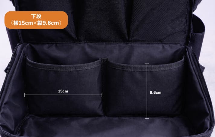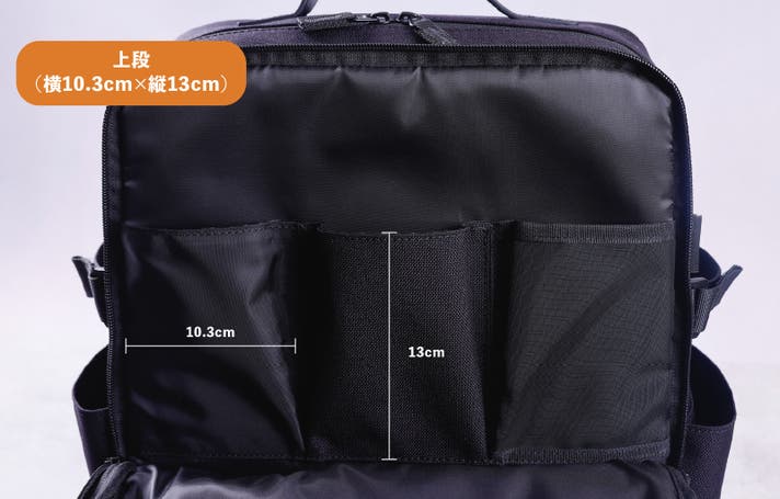 - 2階建て5段ポケットが荷物の住所を固定。底に沈む小物を探す時間を短縮し、移動の機動力を最大化。