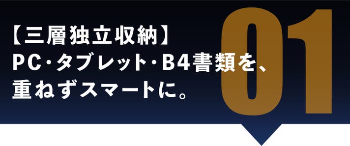 バッグの底をかき回し、中身をひっくり返す。そんなビジネスパーソンの品格を損なう所作は、過去のものです。上下に独立した「空中収納」が、すべての持ち物を指先が覚える位置へと固定。視線を落とさずとも、必要なデバイスや小物を取り出せます。