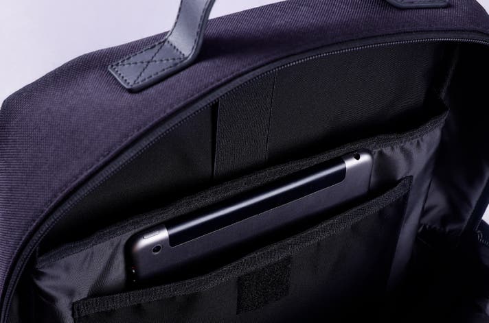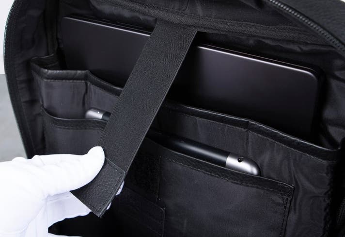 PCポケットの手前には、iPad等のタブレットがジャストサイズで収まるスリーブを完備。デバイス同士の擦れを防ぎます。