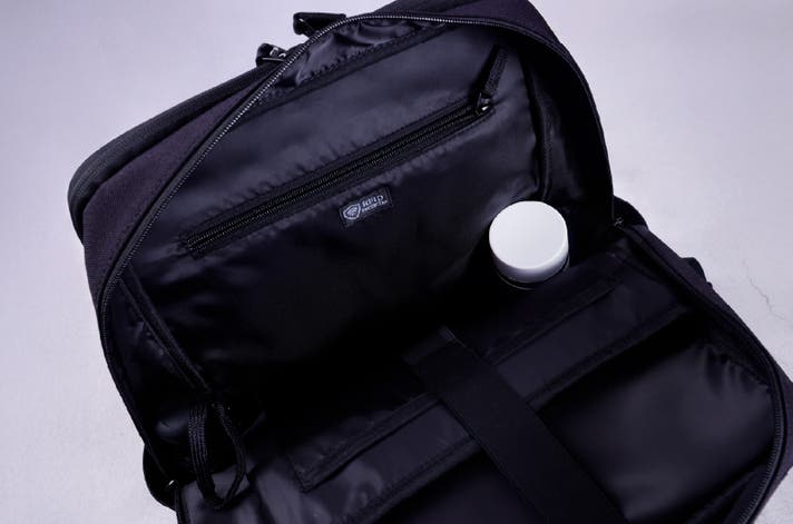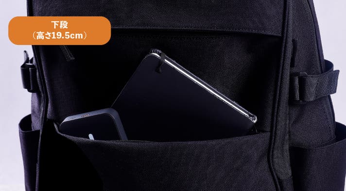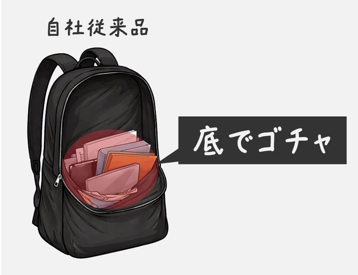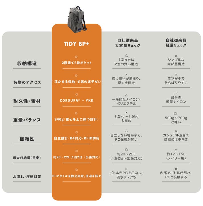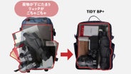 TIDY BP+のメイン収納ポケットは、厚みやサイズの異なるアイテムを「重ねず、並べて」収納できる三層独立構造を採用しました。