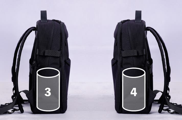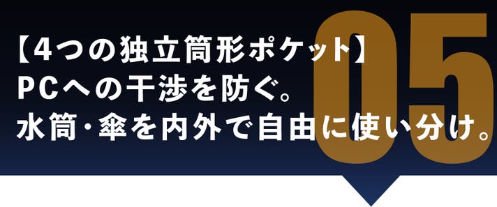 「リュックの中で水筒が倒れて、PCや書類が濡れてしまった」 そんなビジネスマンにとっての悪夢を、物理構造で完全にシャットアウトします。本製品には、メイン室内に2つ、外側サイドに2つの合計4つの独立した筒形ポケットを贅沢に配置しました。