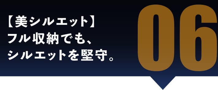 メインポケットと2階建てポケットの2層に分かれていることで、内部で荷物が一箇所に偏るのを防ぎます。横から見た時のラインが常にフラットで、スーツスタイルでも野暮ったくなりません。