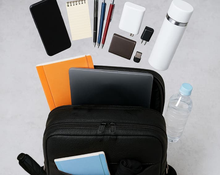 スマートフォン / 充電ケーブル / ミニ財布 / ハンドクリーム / モバイルバッテリー / 鍵1本 / スマートキー1本 / イヤホン / 旅行用パッキング / PC / タブレット / B4資料 / 折り畳み傘 / ペットボトル / 水筒 / メガネケース / ガジェットケース(大) / ガジェットケース(小) / IDケース / 名刺ケース / メモ帳 / ハンドタオル