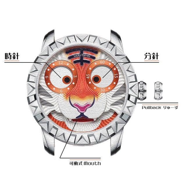 【LuckyHarvey】専用オリジナルムーブメント搭載、時針(左目) / 分針(右目) / 口 。