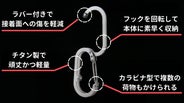 今回のバッグハンガーは、フック部分を本体内部に収納できる構造になっており、普段は軽量で頑丈なチタン製カラビナとして活躍します。