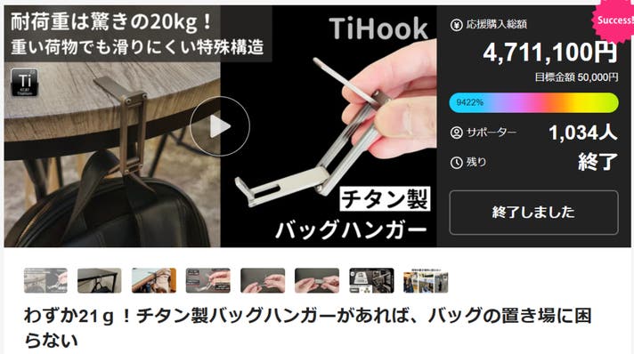前回のチタン製バッグハンガーTiHookは、1,000人を超える多くの方々に応援購入いただき、大変ご好評をいただきました。