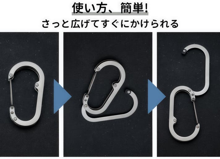 - 【瞬時に変形】カラビナとして使いながら、テーブルや棚に掛ければ即席バッグハンガーに早変わり
