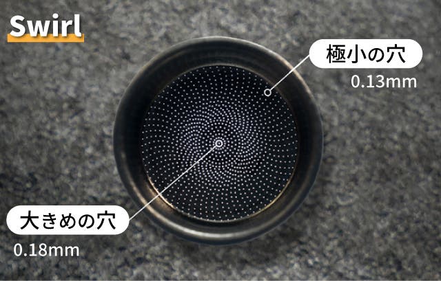 外縁には極小の穴(0.13mm)、中央には大き目の穴(0.18mm)を交互に配置し、隙間と密を交互に配置することで、コーヒーパックを通してダイナミックな水の流れを生み出します。