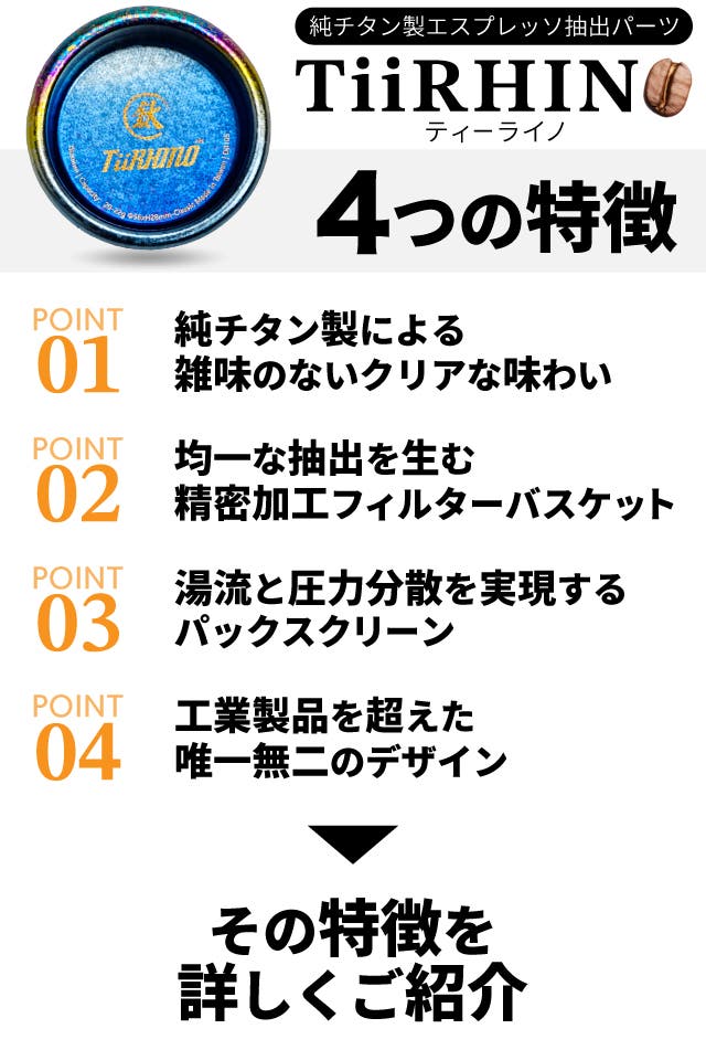 TiiRHINOは、優れた抽出環境を実現するために、純度の高いチタンを採用しています。チタンは、ステンレスのような金属特有のにおいがなく、コーヒー本来のピュアな風味を損ないません。