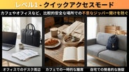 - 【鍵も暗証番号も不要】状況に応じて2段階のセキュリティレベルを切り替え、スリ被害を未然に防ぐ