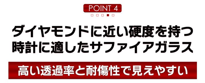 風防には今や時計の定番となっているダイアモンド(硬度10)に近い硬度を持つサファイアガラス(硬度9)が採用されており、ぶつけたり擦ったりした程度では傷が付き難い耐傷性と製造過程で不純物が取り除かれたことによる高い透過性でクリアに見えるディスプレイの視認性を持っています。