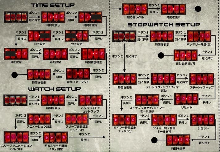 本体のボタンを操作して日付/時間、セグアニメーションパターン、スリープ秒数、バックライト光量、時間(24/12)表示など多くの設定を行っていきます。