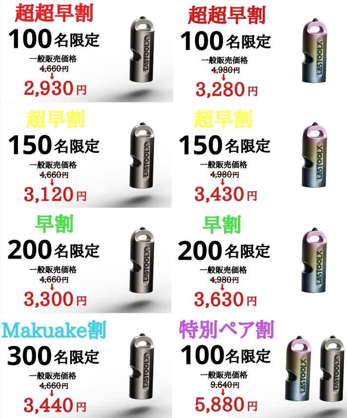 「Makuake(マクアケ)」は、実行者の想いを応援購入によって実現するアタラシイものやサービスのプラットフォームです。このページは、 プロダクトカテゴリの 「【吹く音×割る力】で備える。チタン製・指先サイズの超小型防災ホイッスル」プロジェクト詳細ページです。
