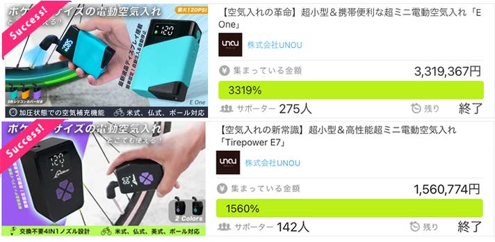 リターン品の配送が完了するまで、株式会社UNOUはTirepower E3 Proミニ電動空気入れの日本における独占販売権を有する正規代理店です。詳細に関しては、ページ下部のリスク&チャレンジをご確認ください。