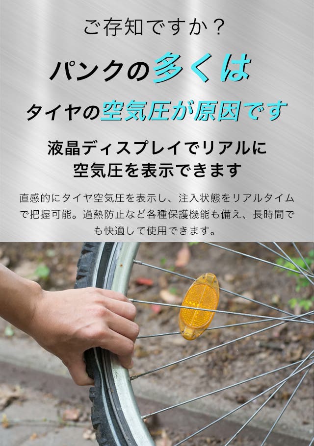 小型で軽量、ポケットやバッグに簡単に収まるサイズで、持ち運びに非常に便利です。アルミニウム合金×カラーメッキ仕上げの美しいボディで、見た目にもこだわりました。加圧状態で再始動でき、タイヤ圧の微調整がスムーズに行える機能を搭載。