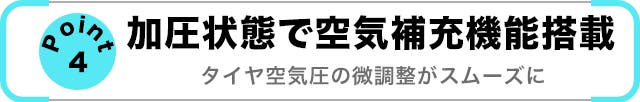 空気補充機能を搭載しており、ポンプ内部の圧力を保持したまま、ゼロから再加圧することなく空気を追加することが可能です。タイヤ圧の微調整がスムーズに行え、繰り返しの補充作業でも効率的に対応できます。特に、高精度な圧力管理が求められる場面や、複数台のメンテナンス時などに非常に重宝します。