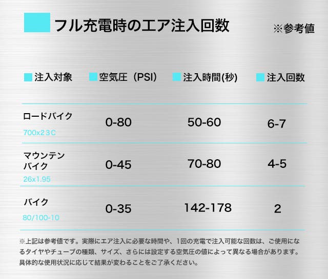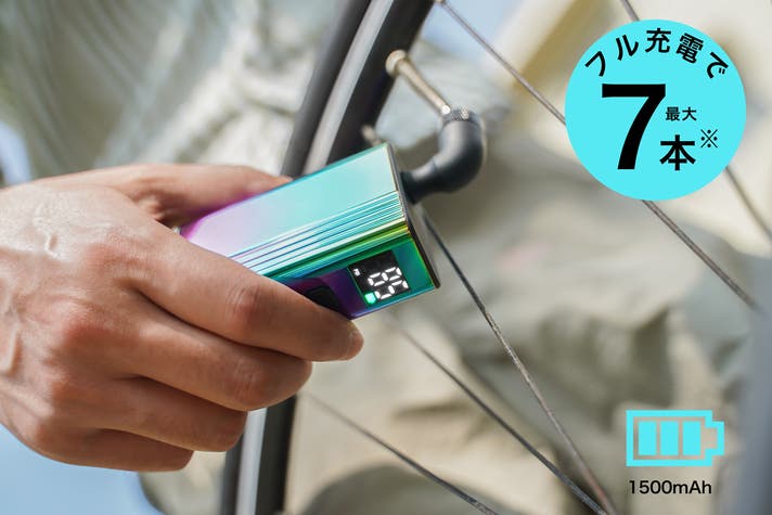 フル充電でロードバイク(700×23C・80PSI)のタイヤ最大約7本分に空気を充填可能!