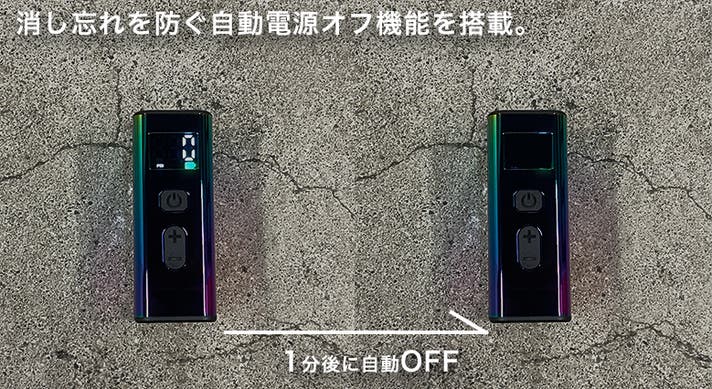 約1分間操作がない場合、自動的に電源がオフになる設計で、無駄な電力消費を防止します。バッテリーの持ちを延ばし、より効率的にご使用いただけます。